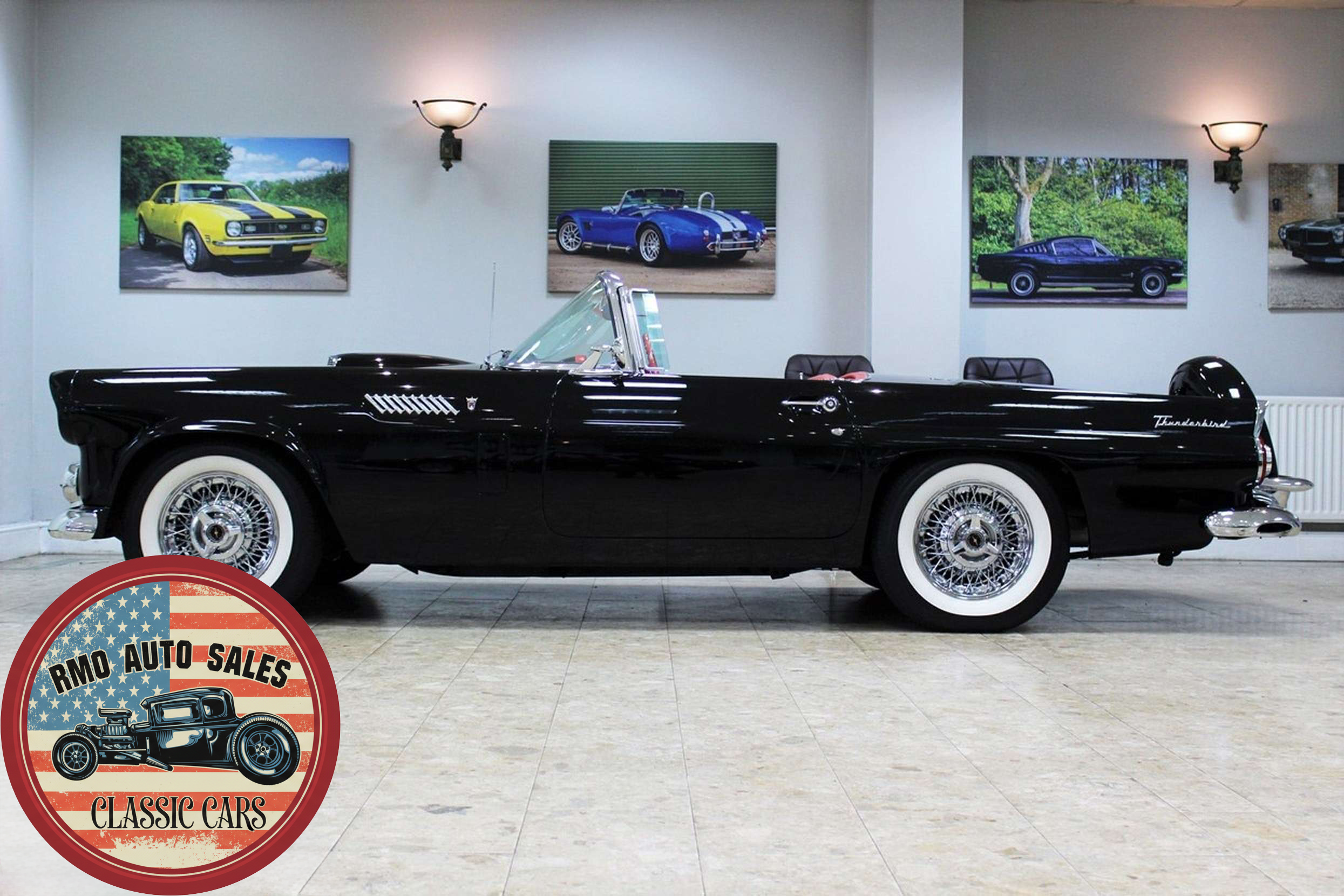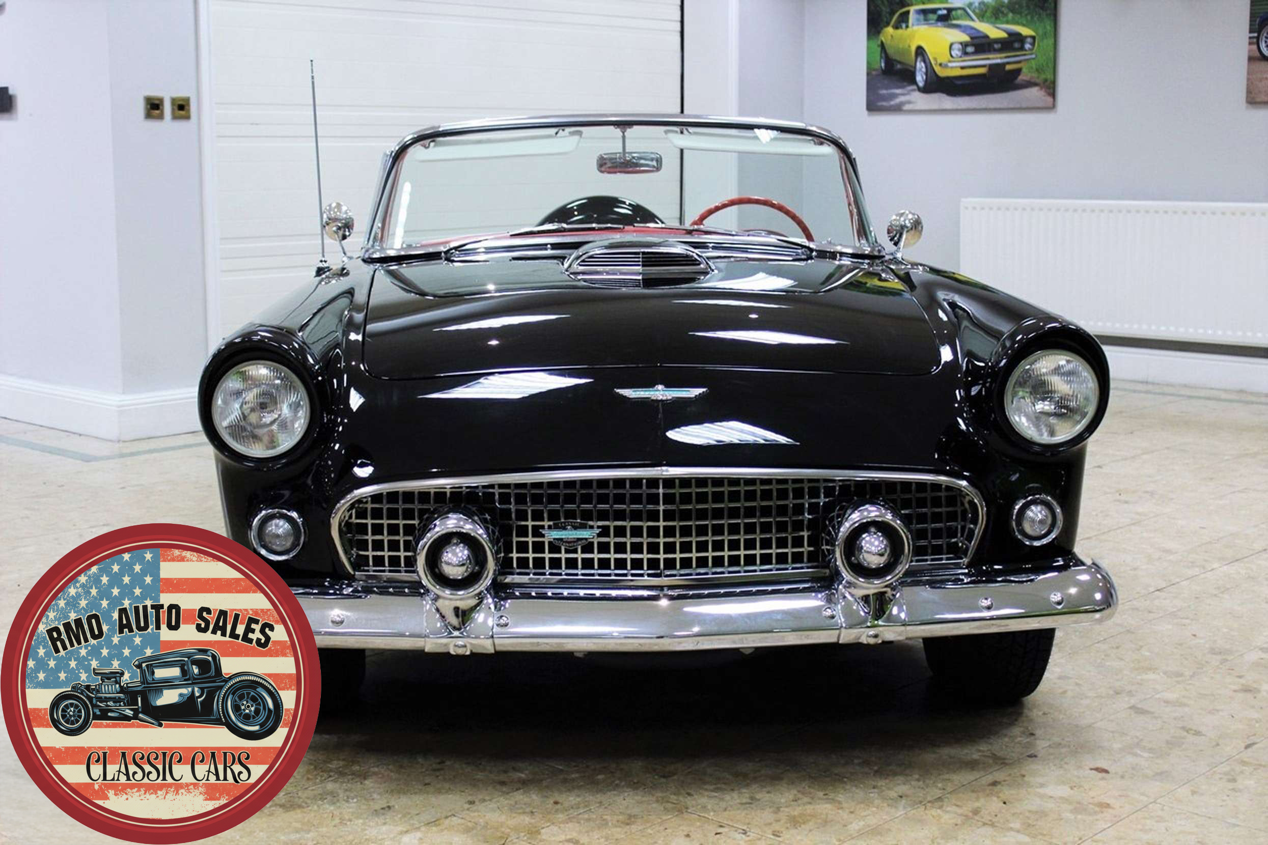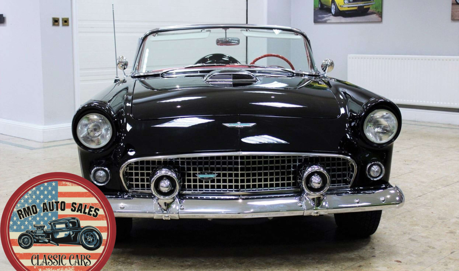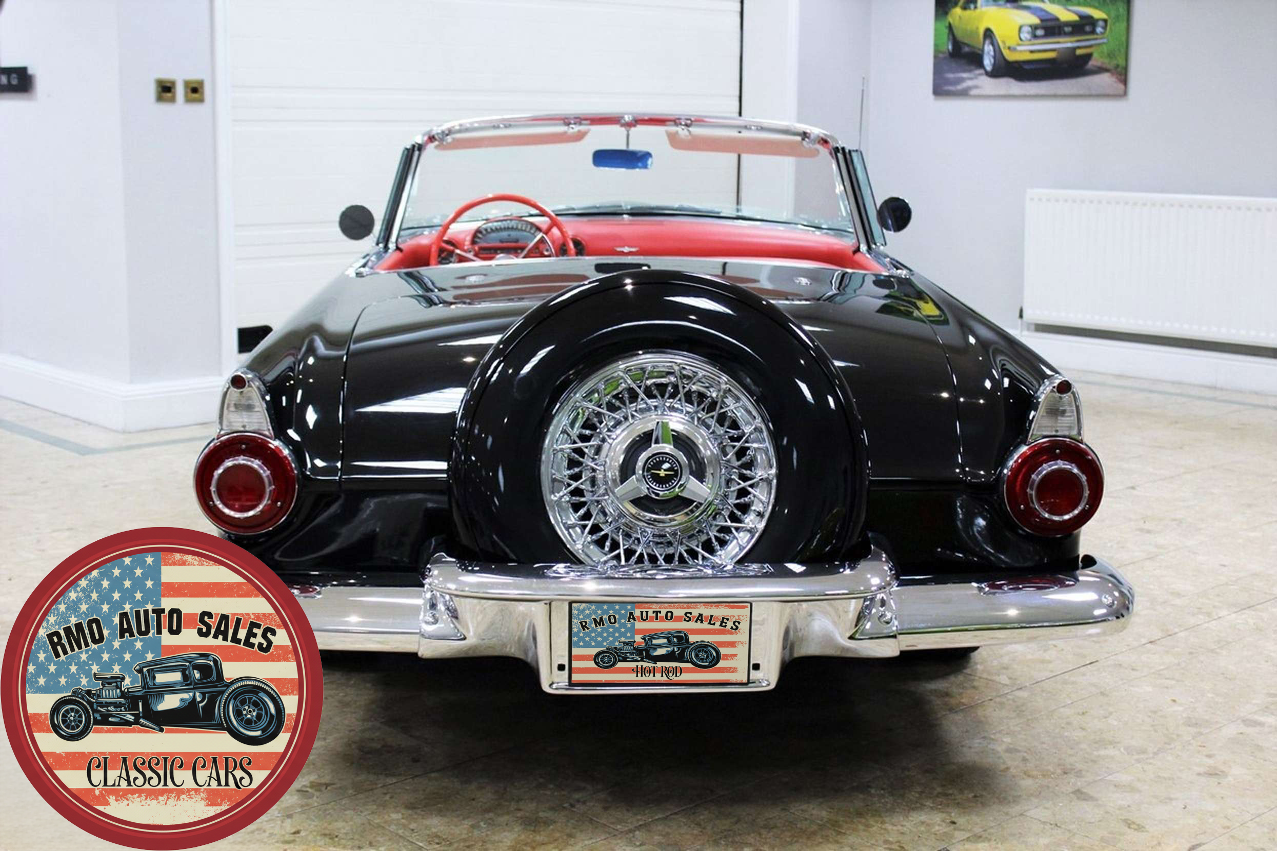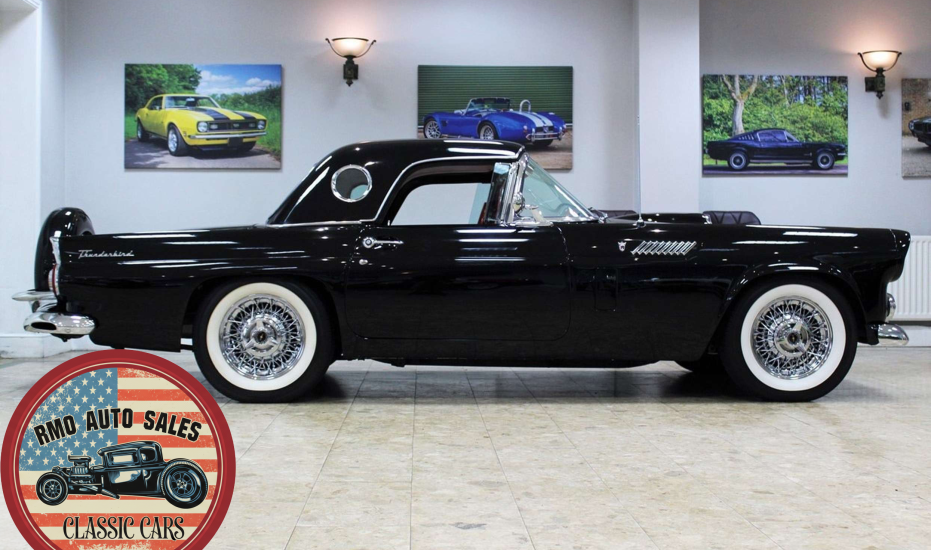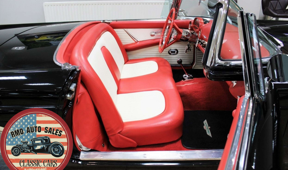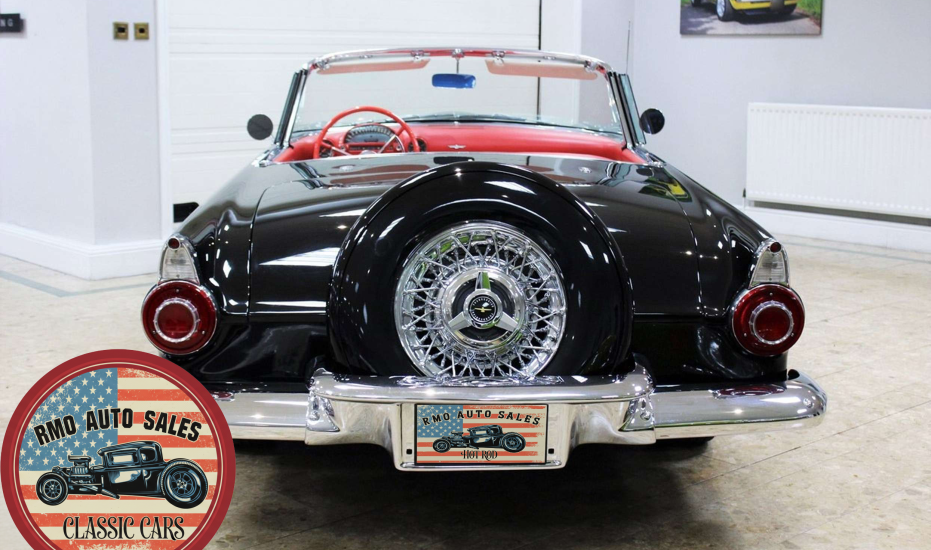 1956 Ford Thunderbird Convertible 292 V8 Auto. Black with red seats and interior and white panel inserts, black carpets and white roof. Porthole hardtop in matching black and chrome wire wheels with white-wall tyres.