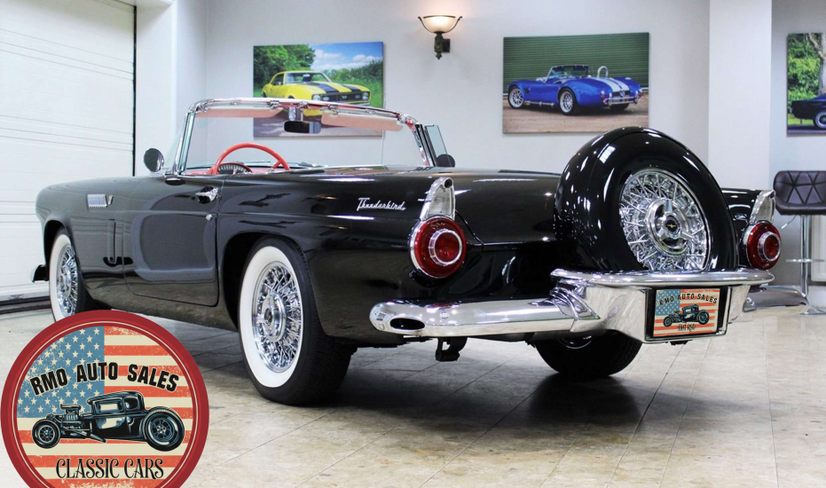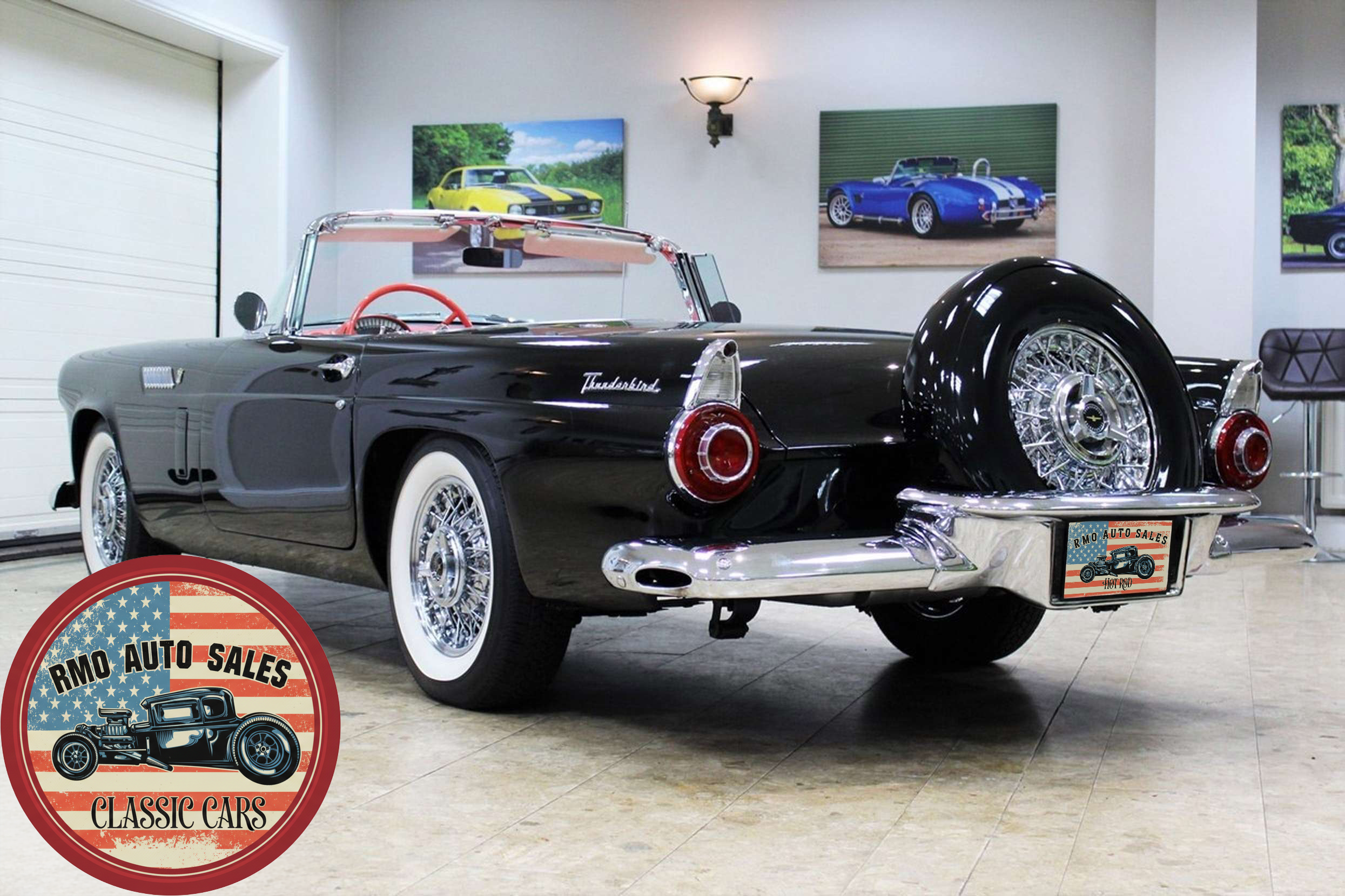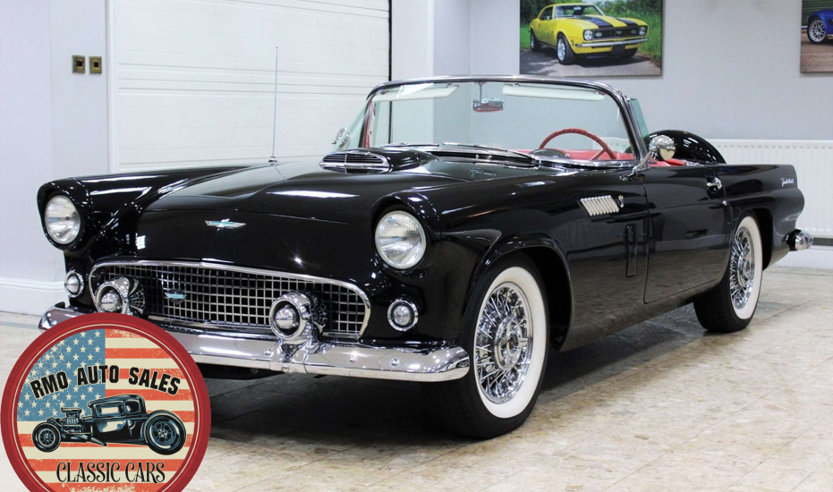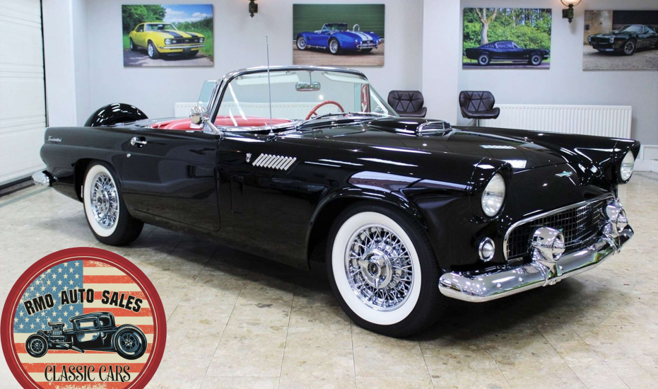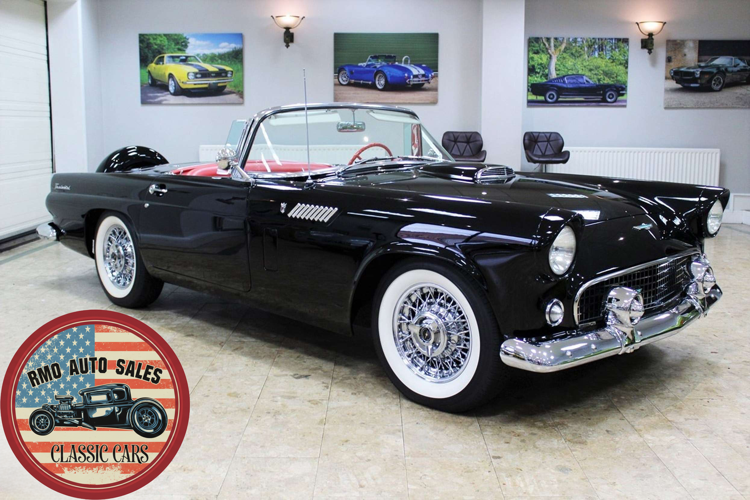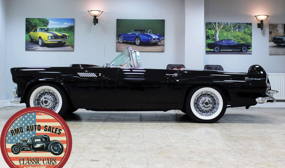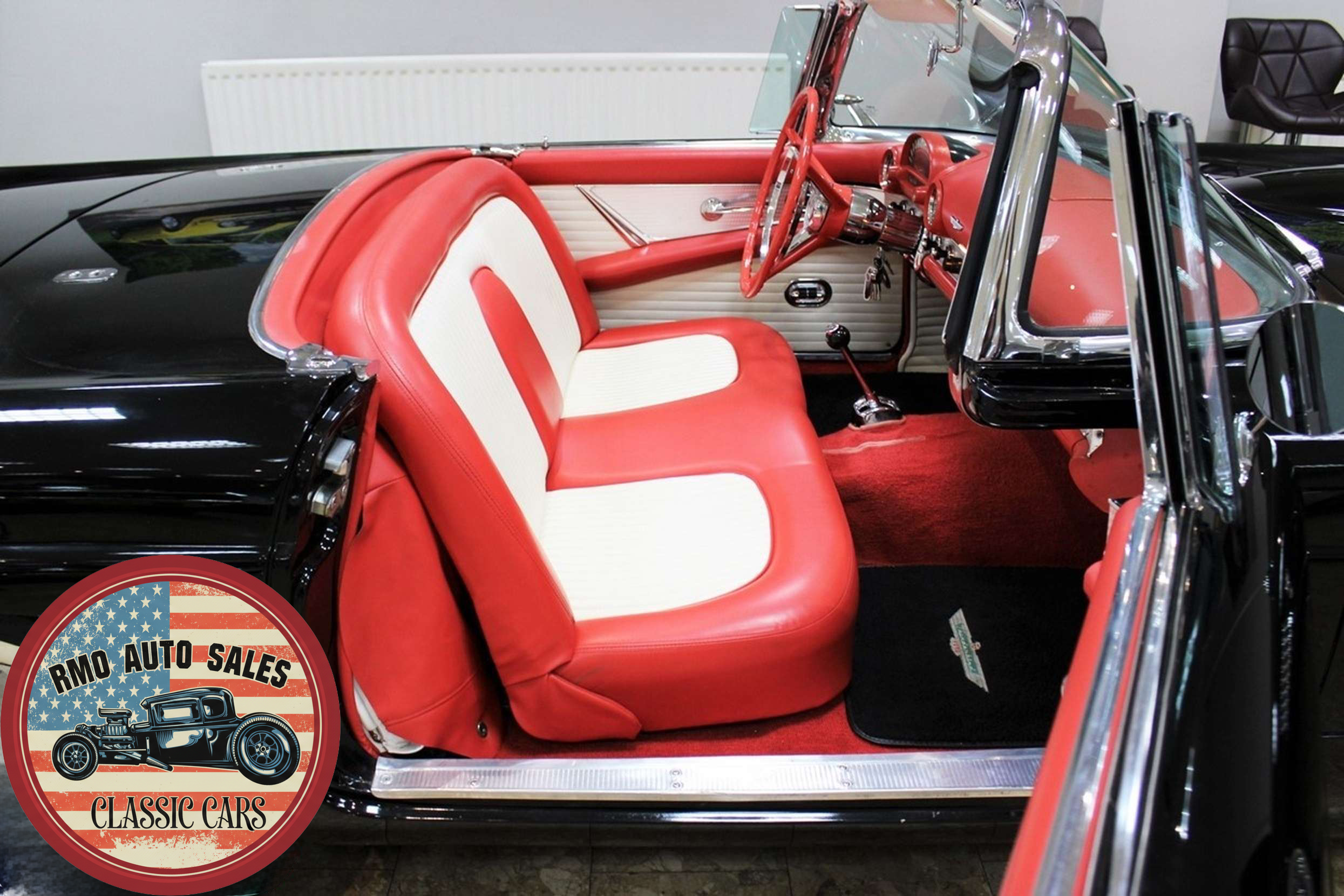 1956 Ford Thunderbird Convertible 292 V8 Auto. Black with red seats and interior and white panel inserts, black carpets and white roof. Porthole hardtop in matching black and chrome wire wheels with white-wall tyres.
