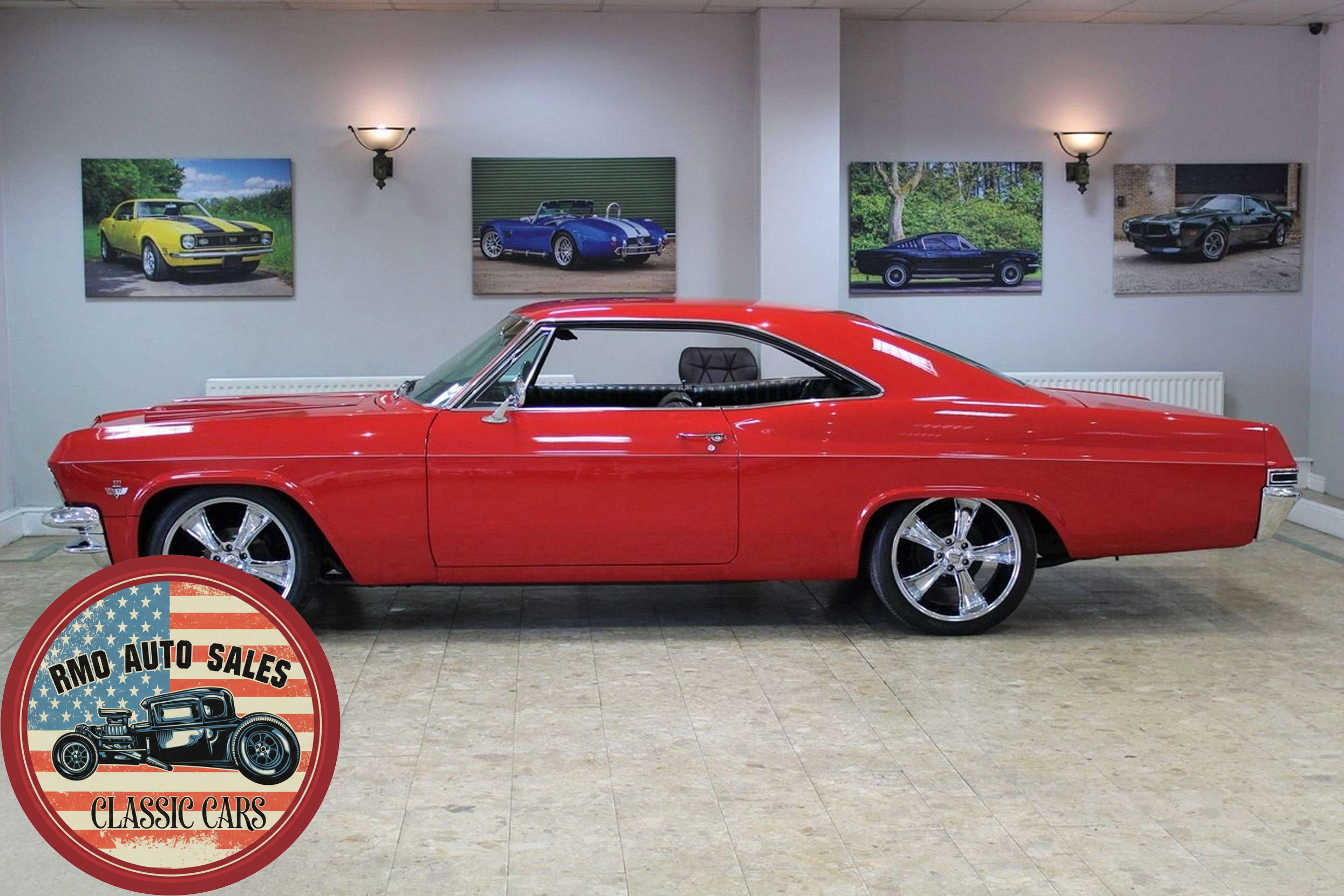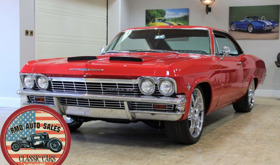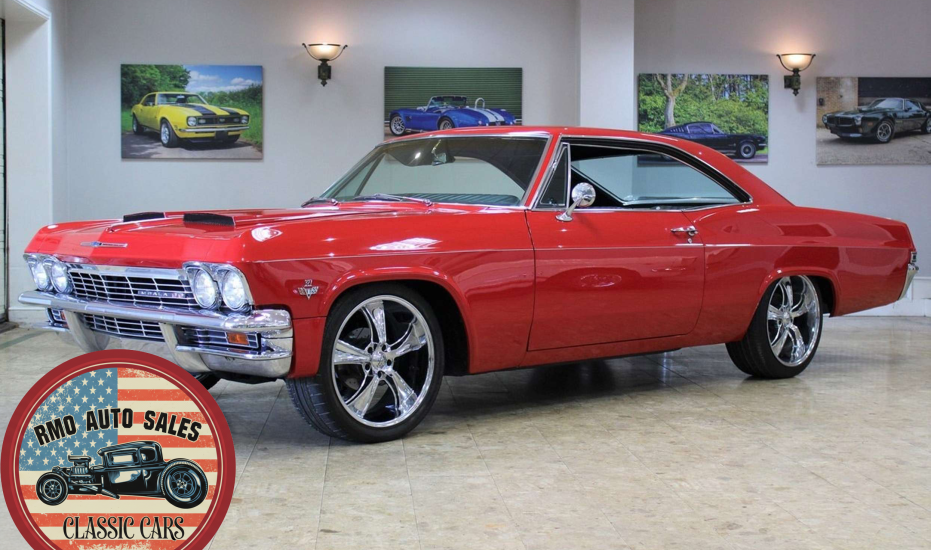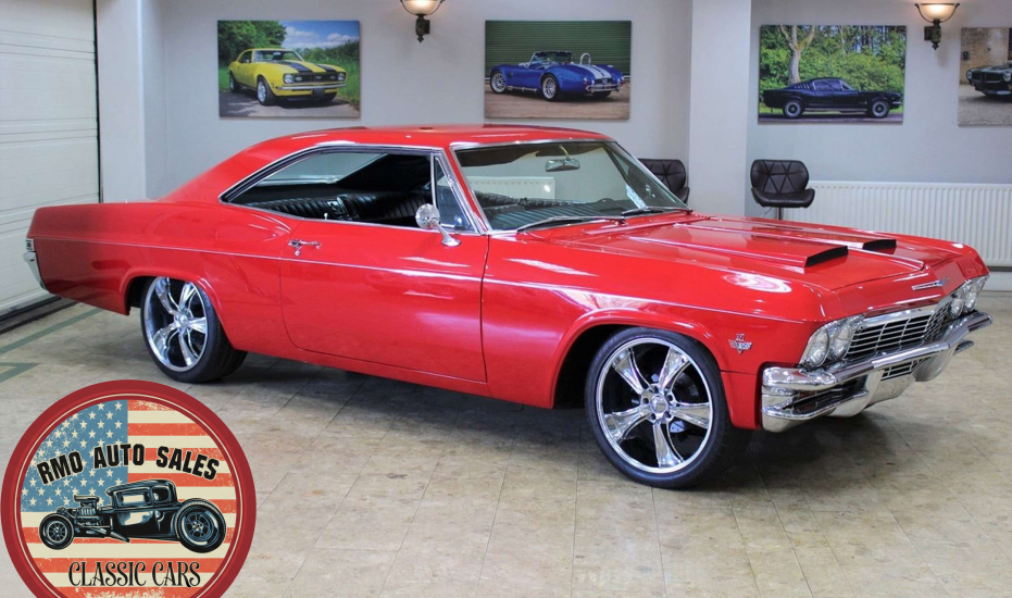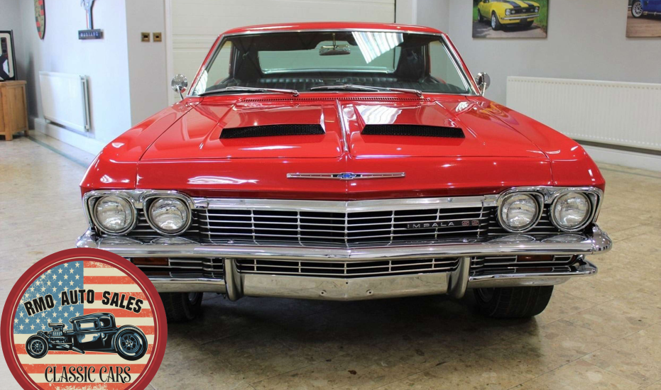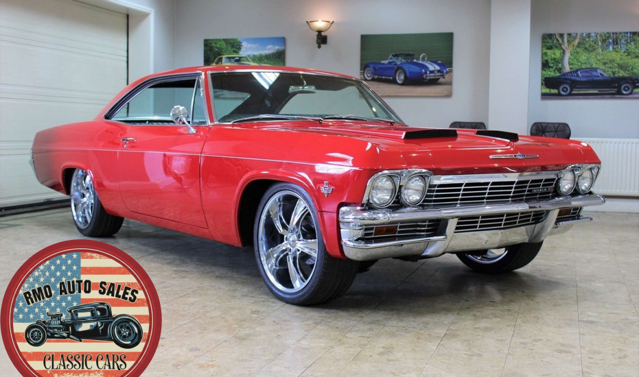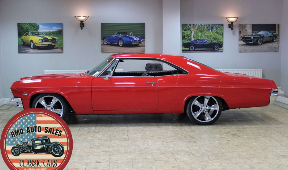 1965 Chevrolet Impala 2-door Pillarless Coupe. A genuine SS finished in Regal Red paintwork with black factory bucket seats and interior and original Chevrolet Radio. Fully restored to a high standard presenting with gleaming coachwork and immaculate factory trim. Equipped with Power steering, electric windows, 4-wheel Disc Brakes and 20-inch American Racing polished alloy wheels.