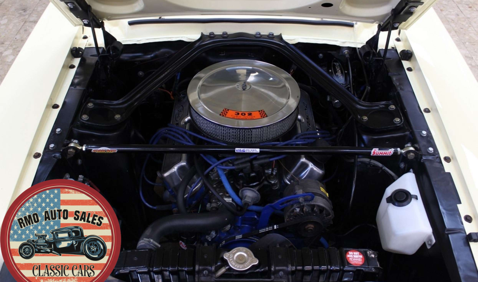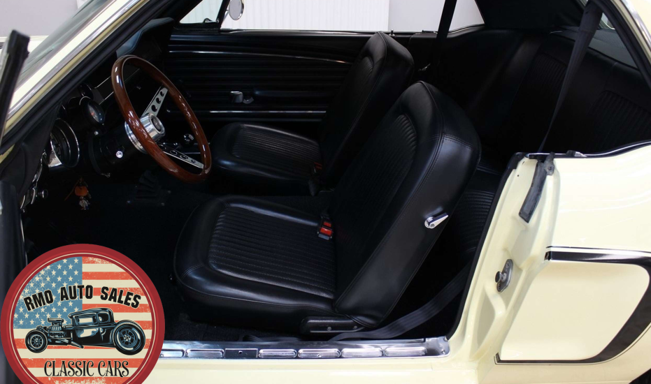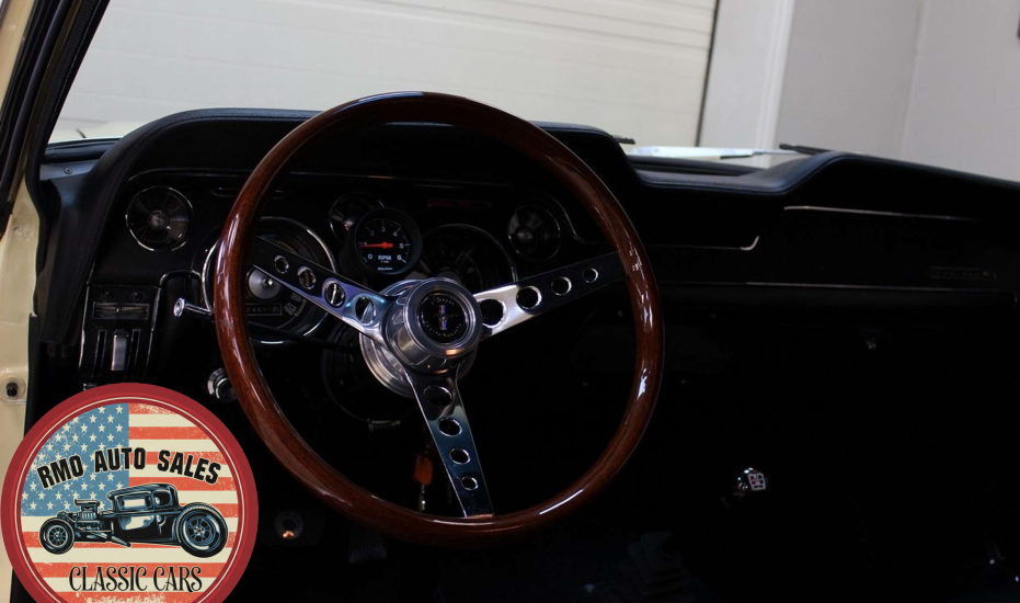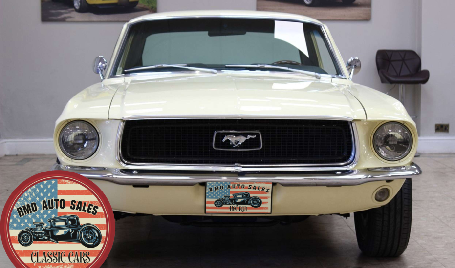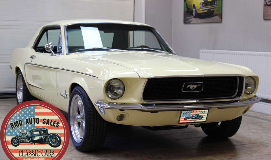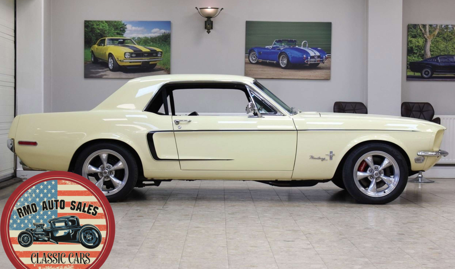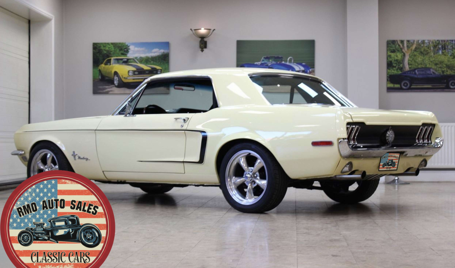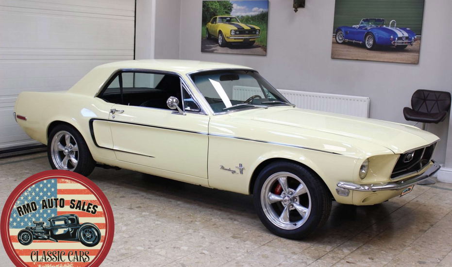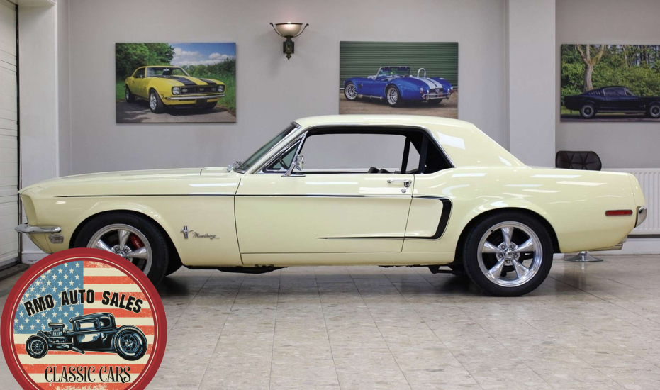 1968 Ford Mustang Coupe with a rebuilt 302 V8 and 5-speed Tremec T5 manual gearbox. Finished in Meadowlark Yellow with black bucket seats, REV polished alloy wheels, satin black factory side decals, and a Mustang wood/alloy steering wheel. Upgraded with front coil-over suspension, Wilwood master cylinder, 13-inch front disc brakes, rear traction bars, Flaming River steering box, stainless braided lines, and a Flowmaster dual exhaust system with ceramic-coated headers.