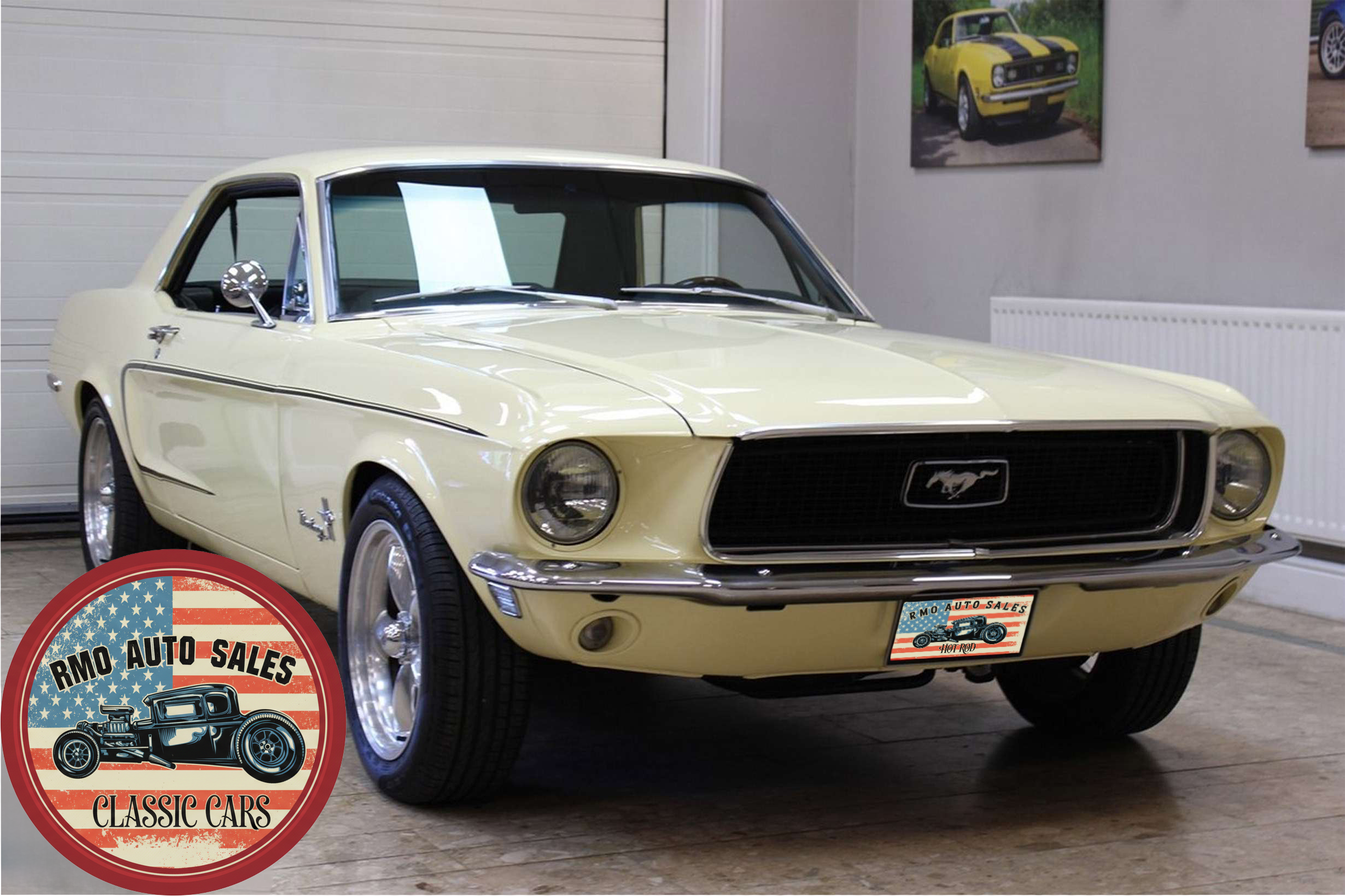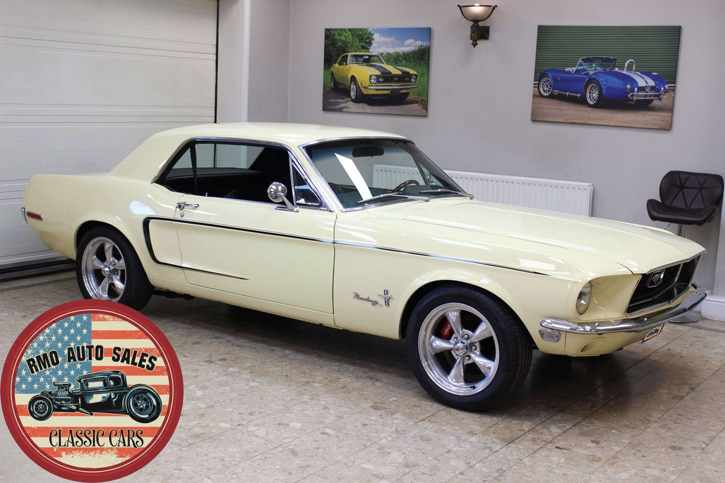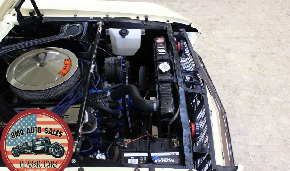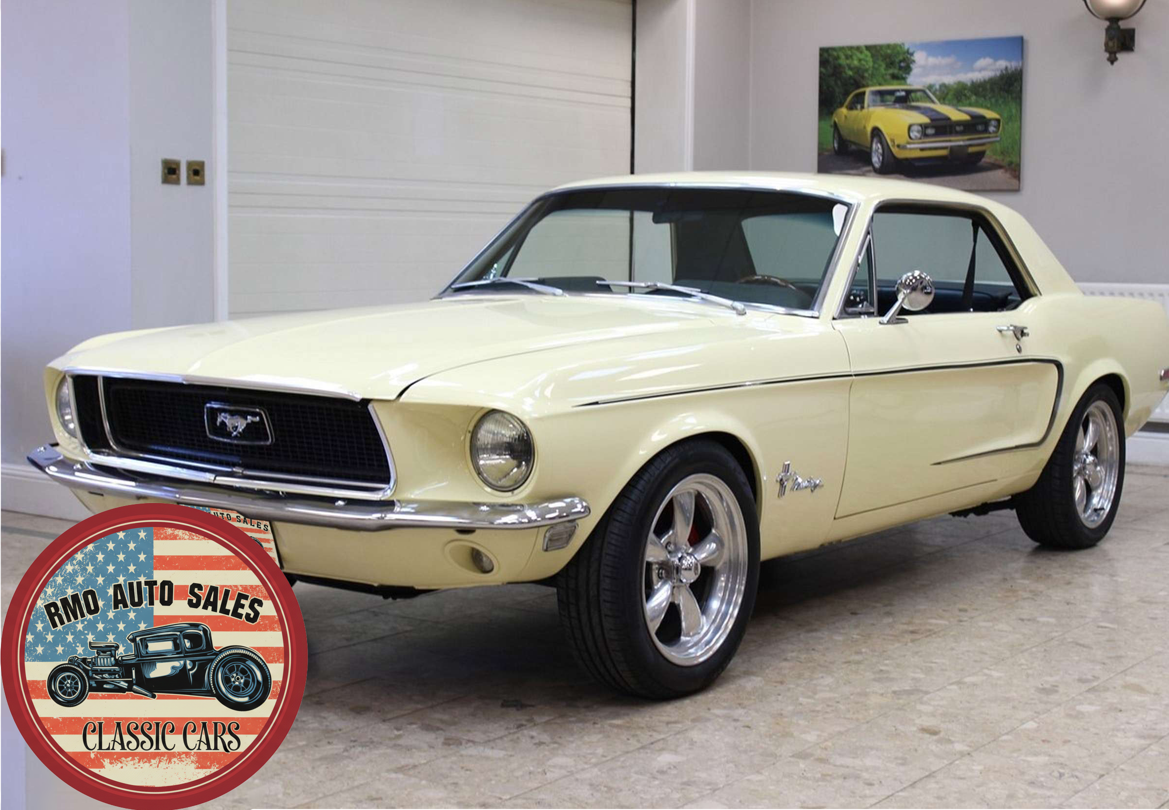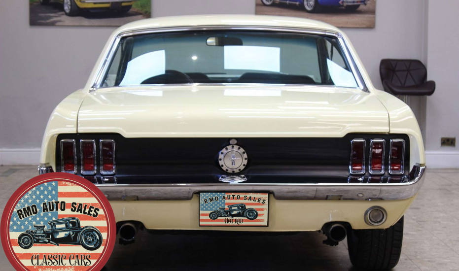 1968 Ford Mustang Coupe with a rebuilt 302 V8 and 5-speed Tremec T5 manual gearbox. Finished in Meadowlark Yellow with black bucket seats, REV polished alloy wheels, satin black factory side decals, and a Mustang wood/alloy steering wheel. Upgraded with front coil-over suspension, Wilwood master cylinder, 13-inch front disc brakes, rear traction bars, Flaming River steering box, stainless braided lines, and a Flowmaster dual exhaust system with ceramic-coated headers.