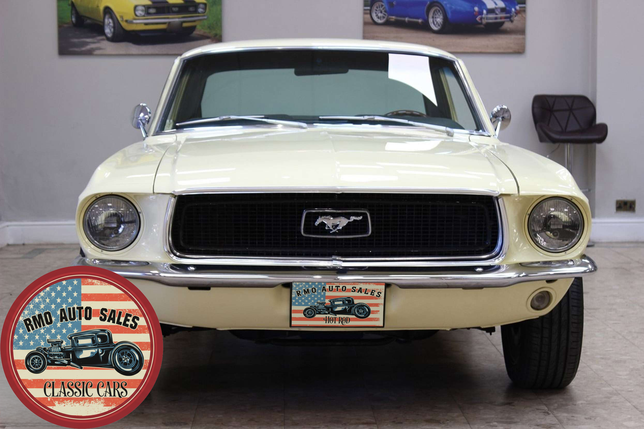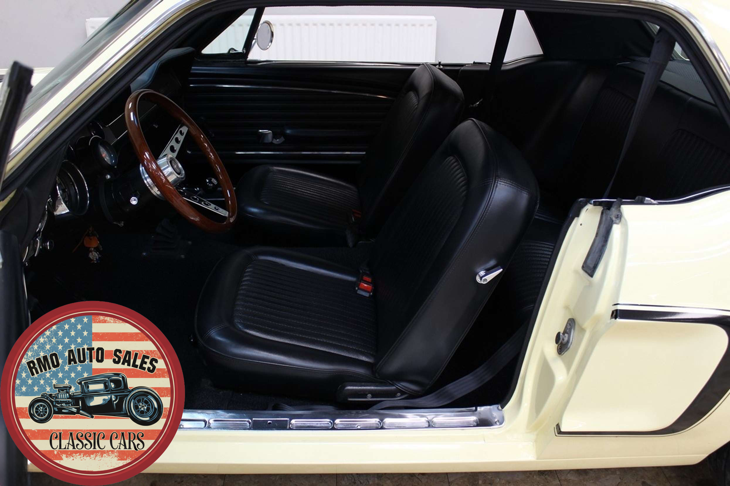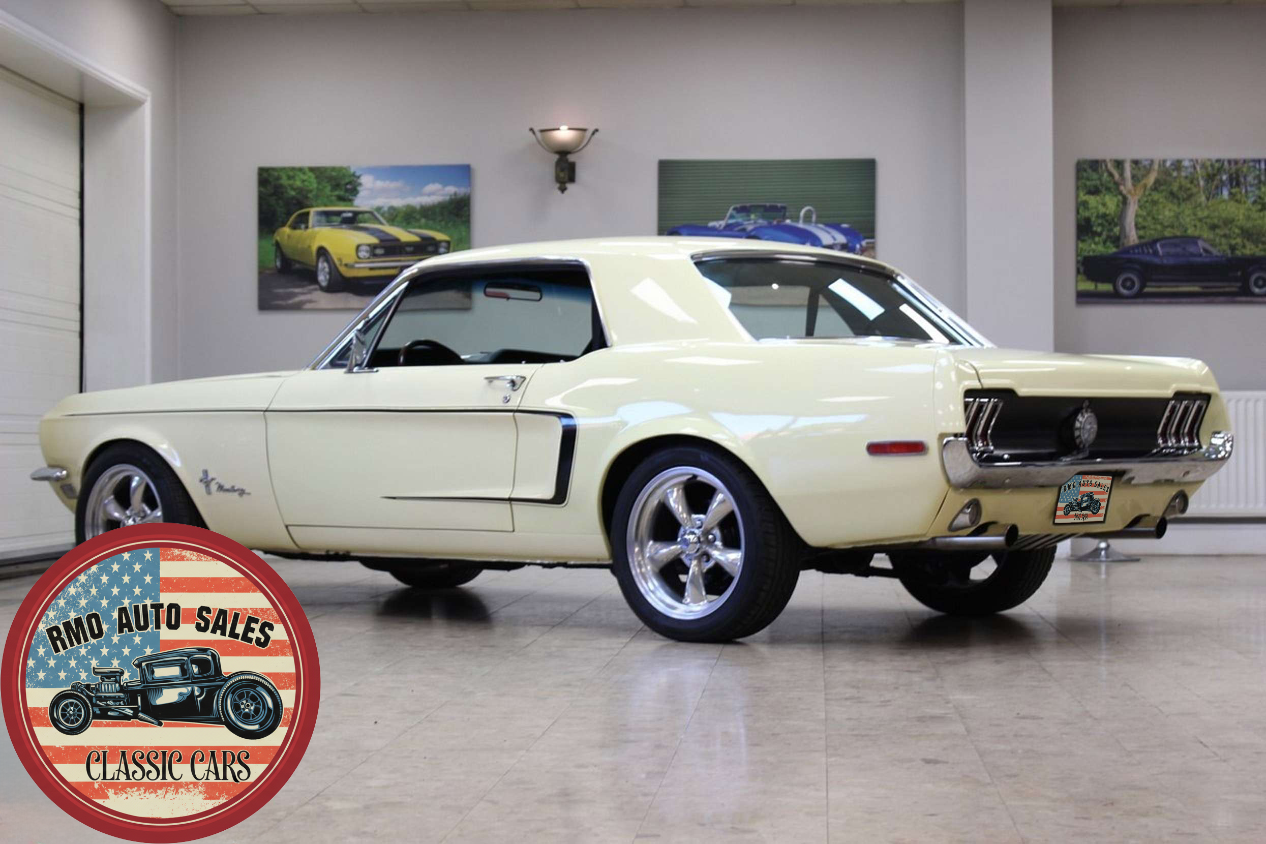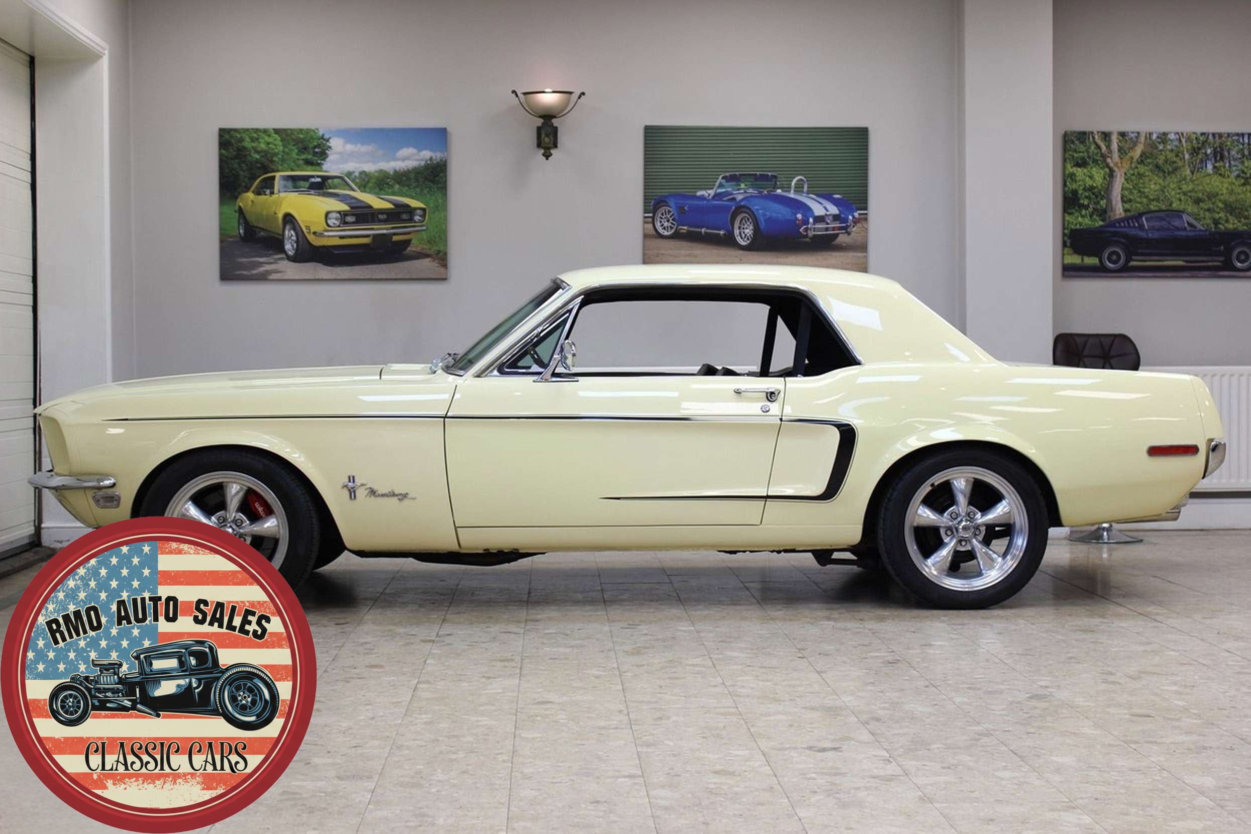 1968 Ford Mustang Coupe with a rebuilt 302 V8 and 5-speed Tremec T5 manual gearbox. Finished in Meadowlark Yellow with black bucket seats, REV polished alloy wheels, satin black factory side decals, and a Mustang wood/alloy steering wheel. Upgraded with front coil-over suspension, Wilwood master cylinder, 13-inch front disc brakes, rear traction bars, Flaming River steering box, stainless braided lines, and a Flowmaster dual exhaust system with ceramic-coated headers.
