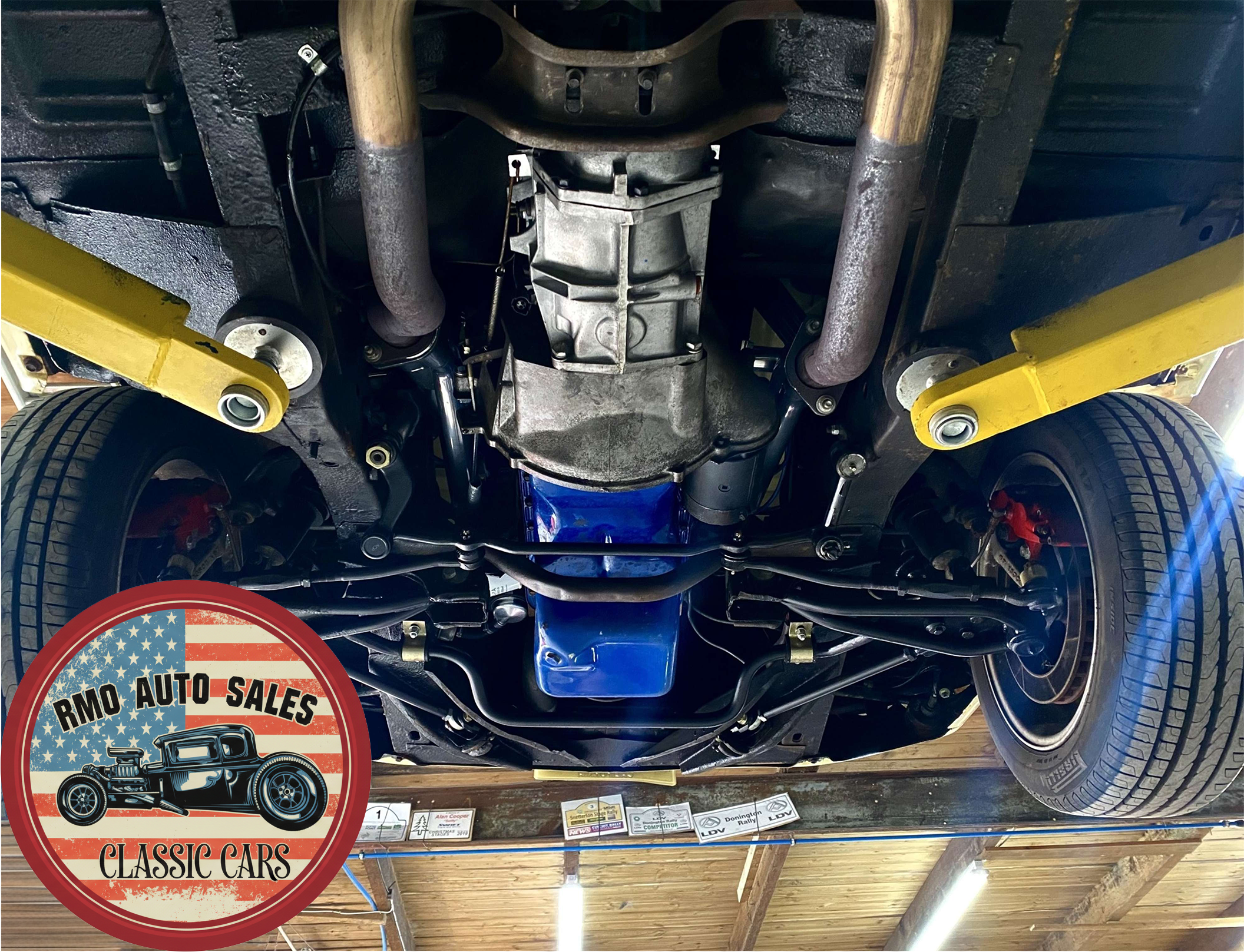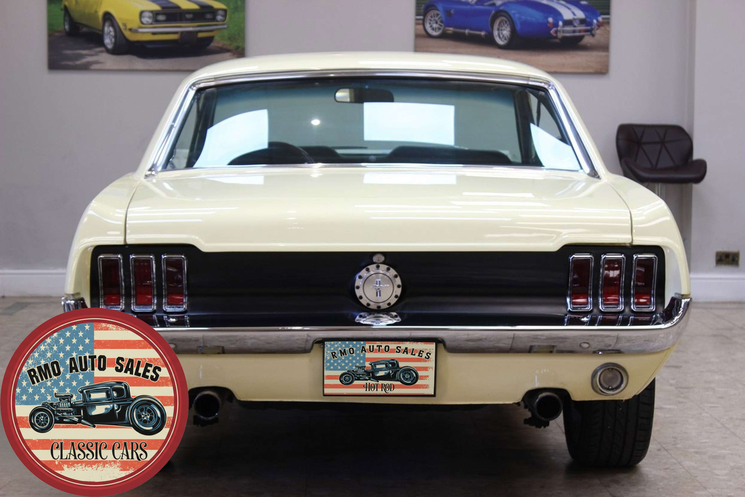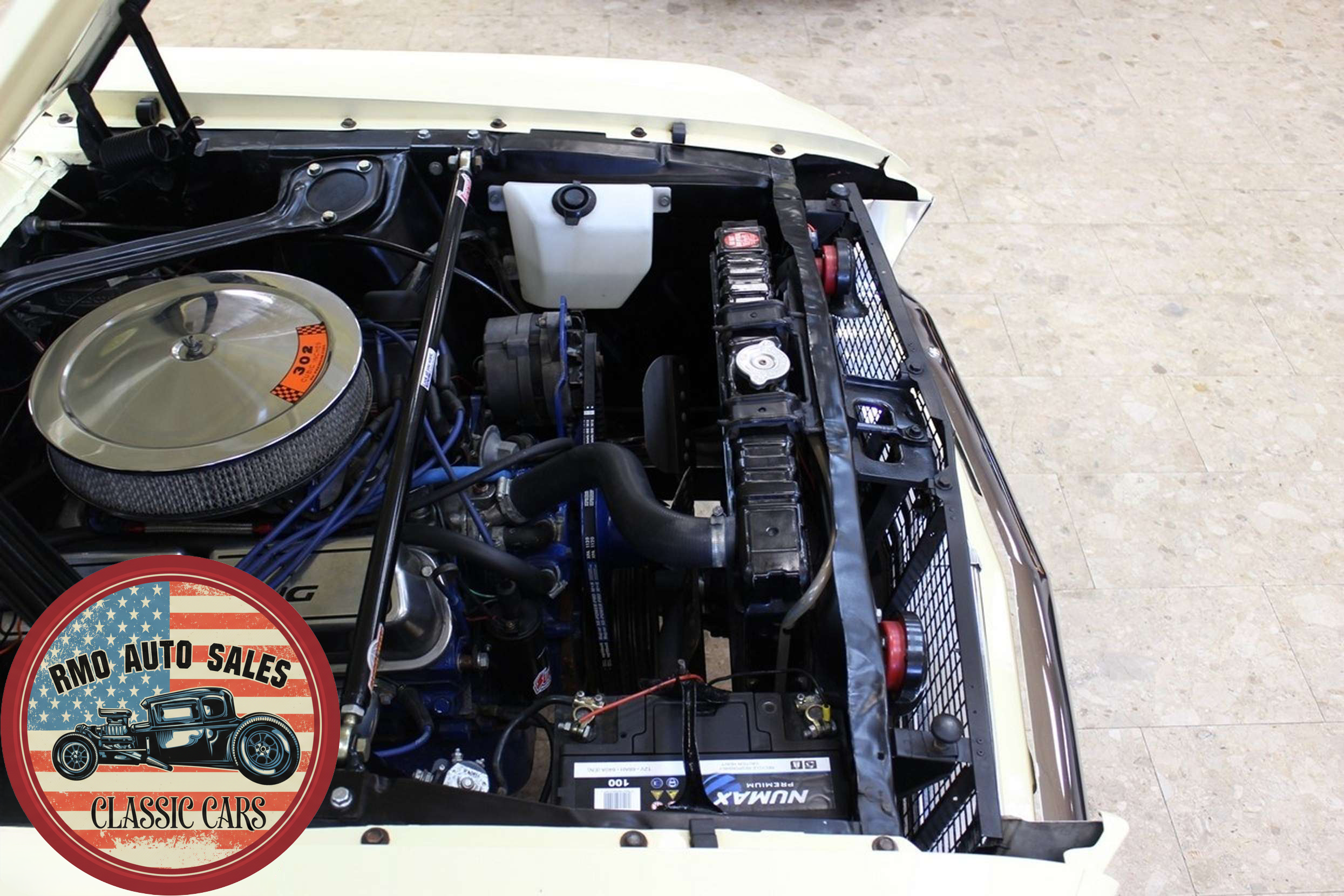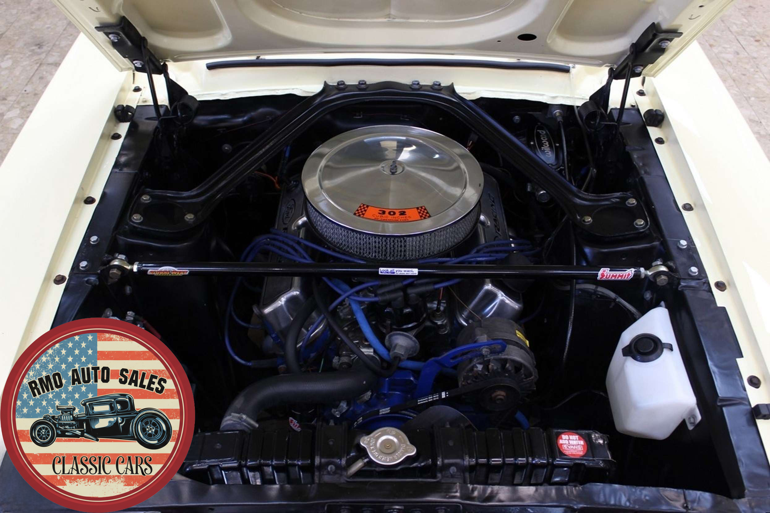 1968 Ford Mustang Coupe with a rebuilt 302 V8 and 5-speed Tremec T5 manual gearbox. Finished in Meadowlark Yellow with black bucket seats, REV polished alloy wheels, satin black factory side decals, and a Mustang wood/alloy steering wheel. Upgraded with front coil-over suspension, Wilwood master cylinder, 13-inch front disc brakes, rear traction bars, Flaming River steering box, stainless braided lines, and a Flowmaster dual exhaust system with ceramic-coated headers.