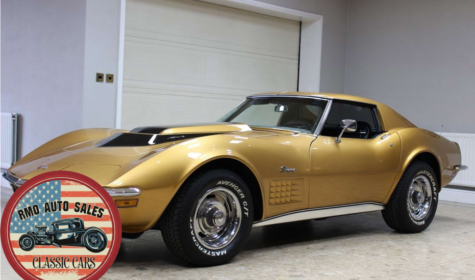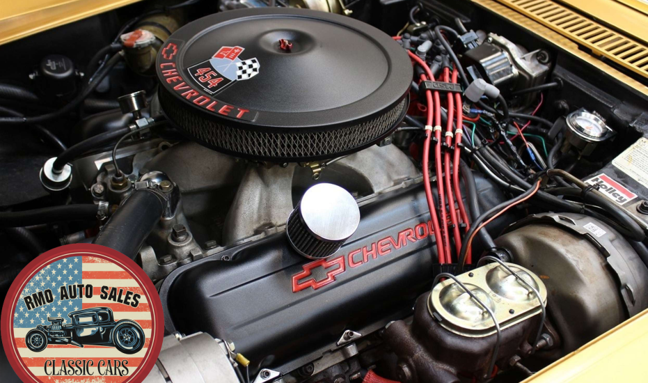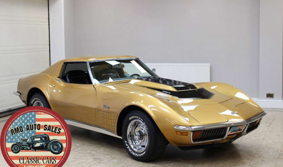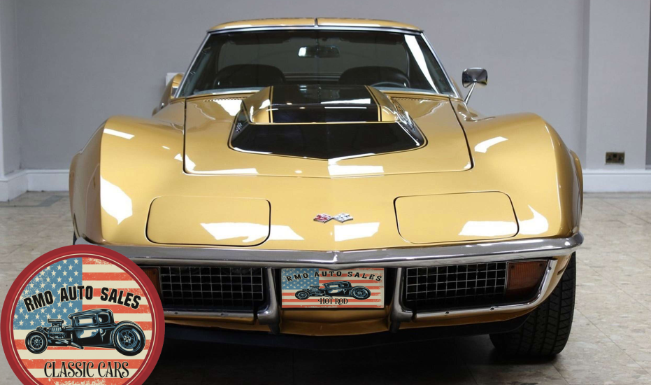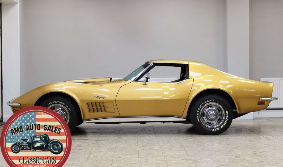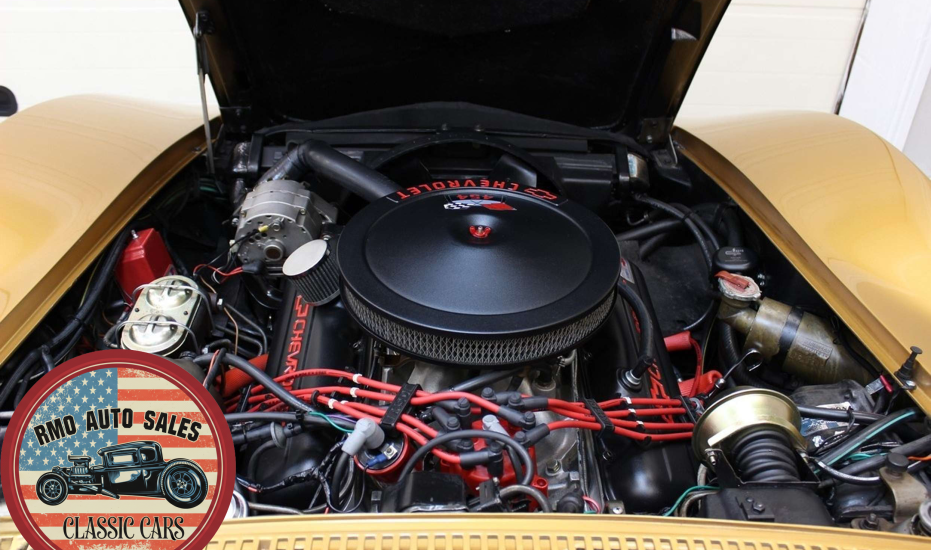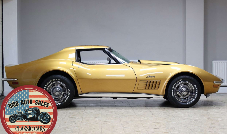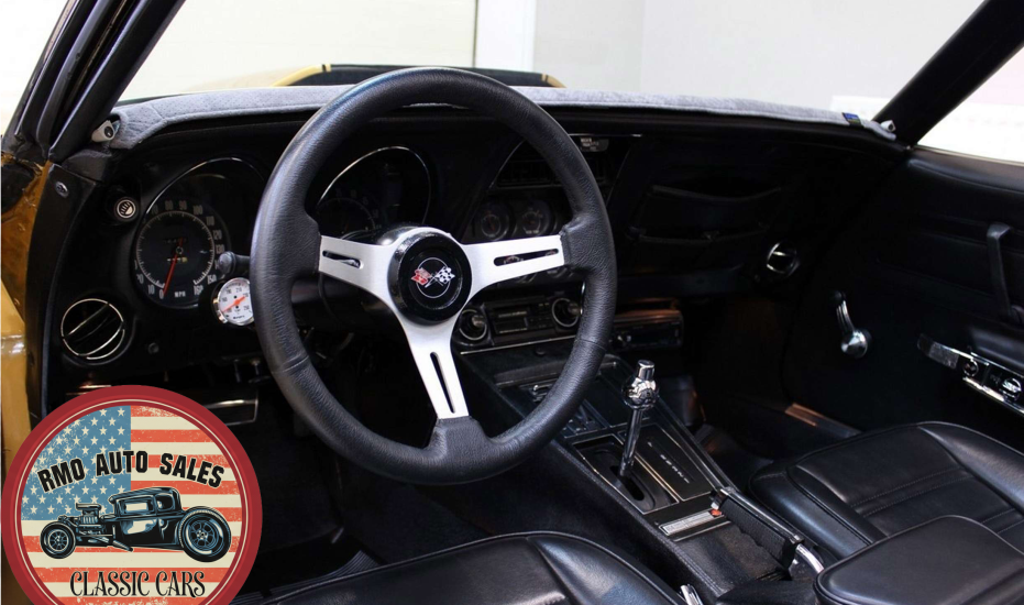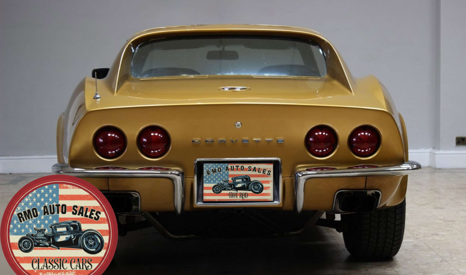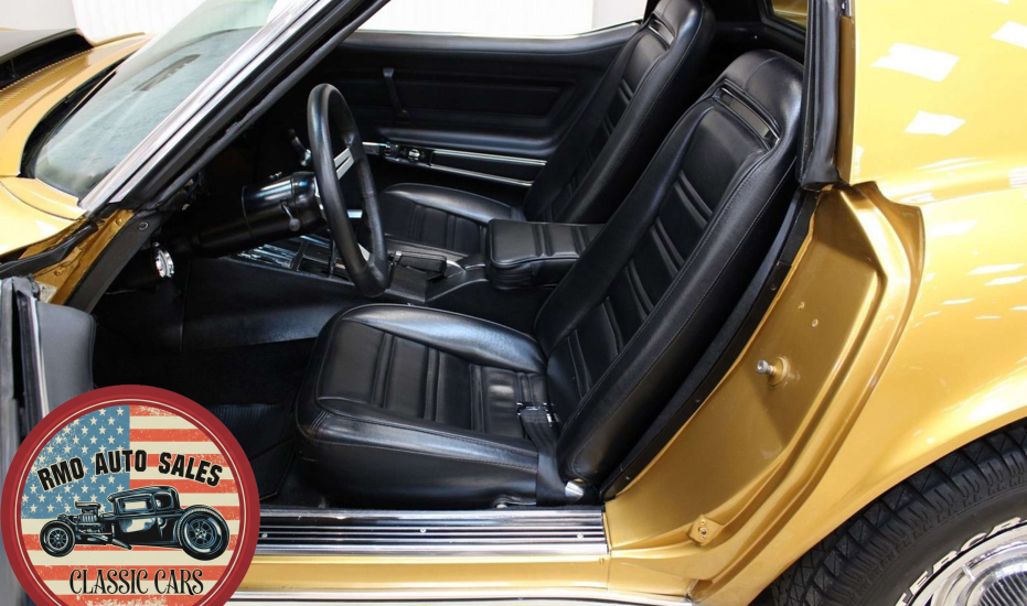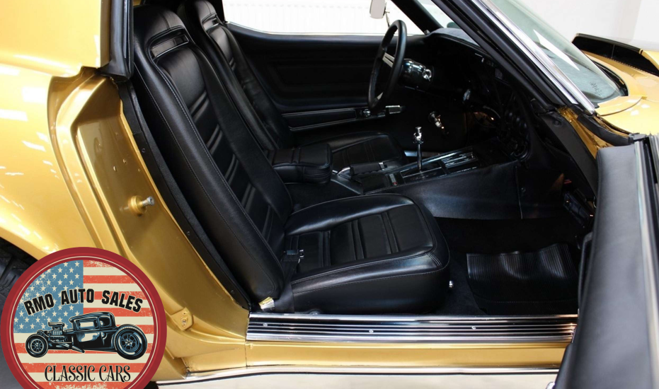 1972 Chevrolet Corvette with a 454 V8 and TH-400 automatic transmission. Finished in War Bonnet Yellow Metallic with black leather seats, featuring factory power steering, 4-wheel power disc brakes, T-top roof, removable rear window, and Rally wheels with Avenger GT radial tires.