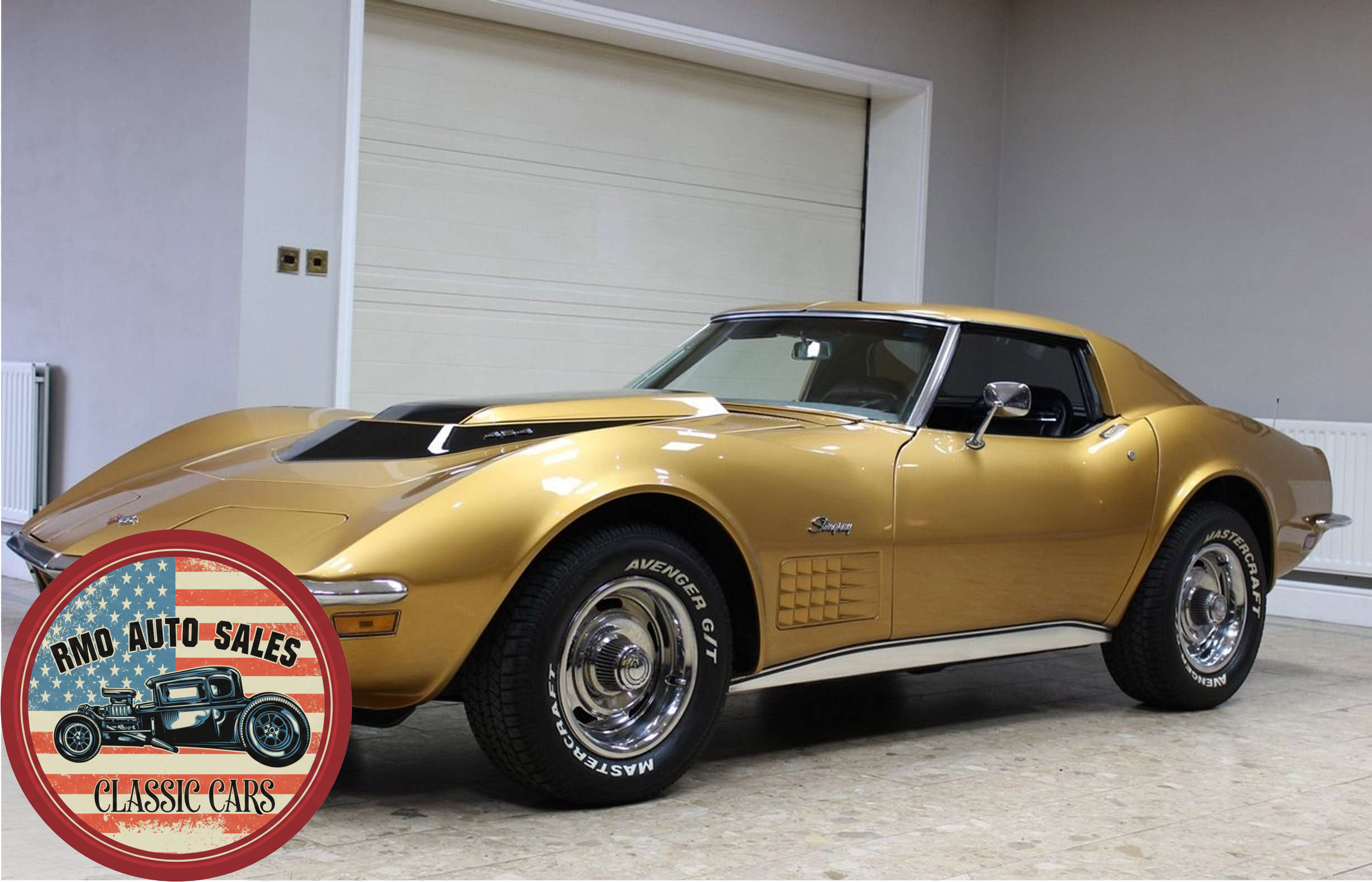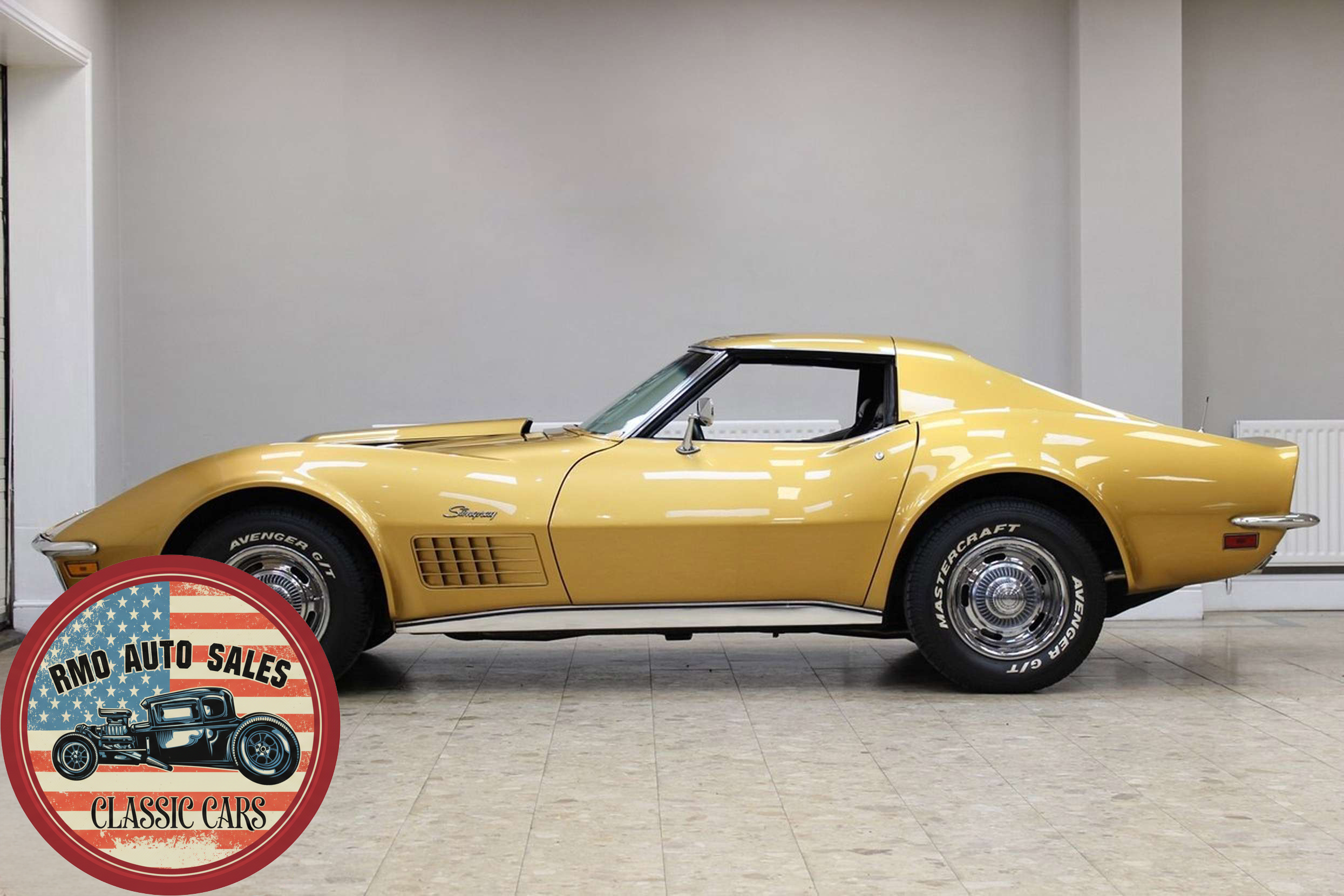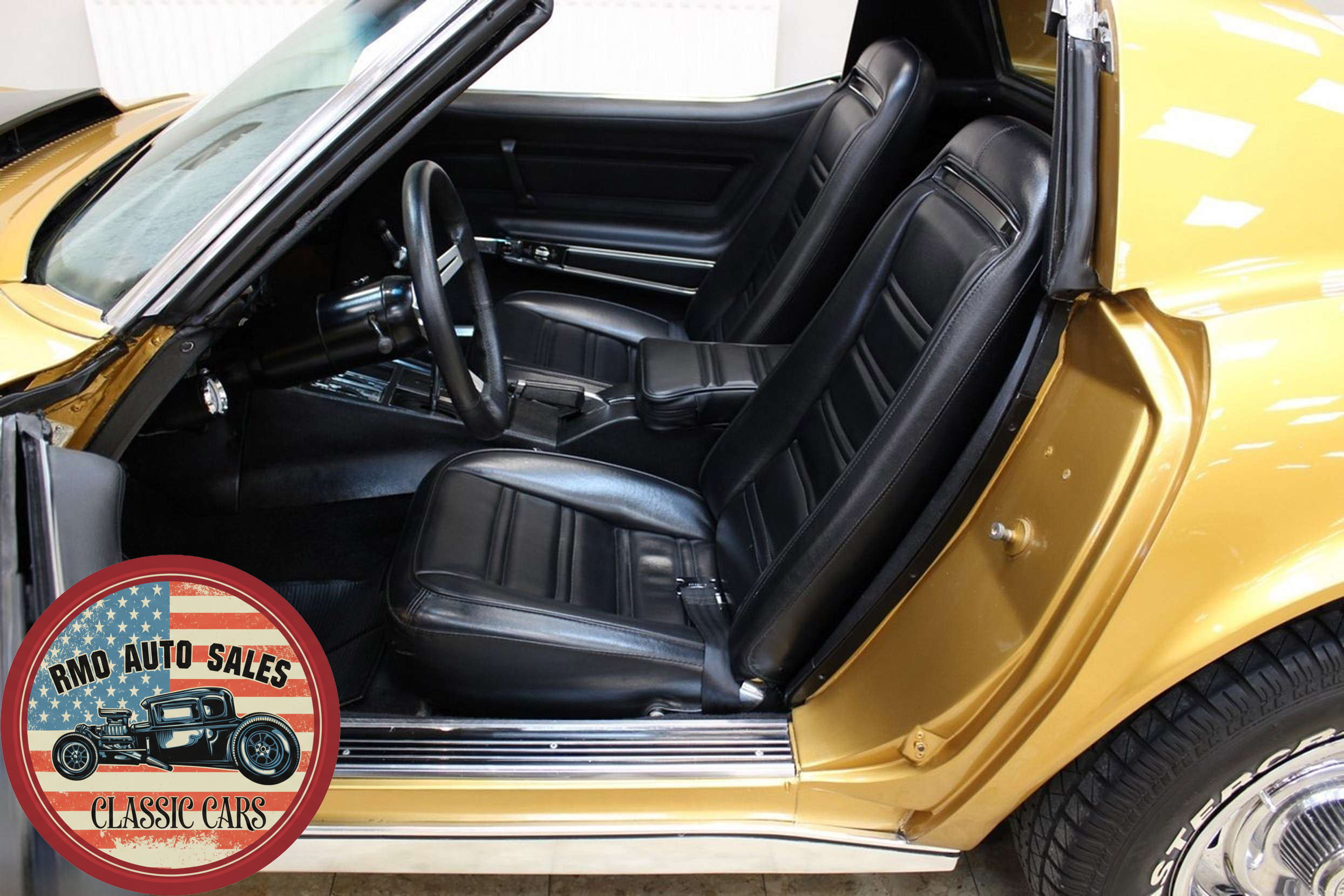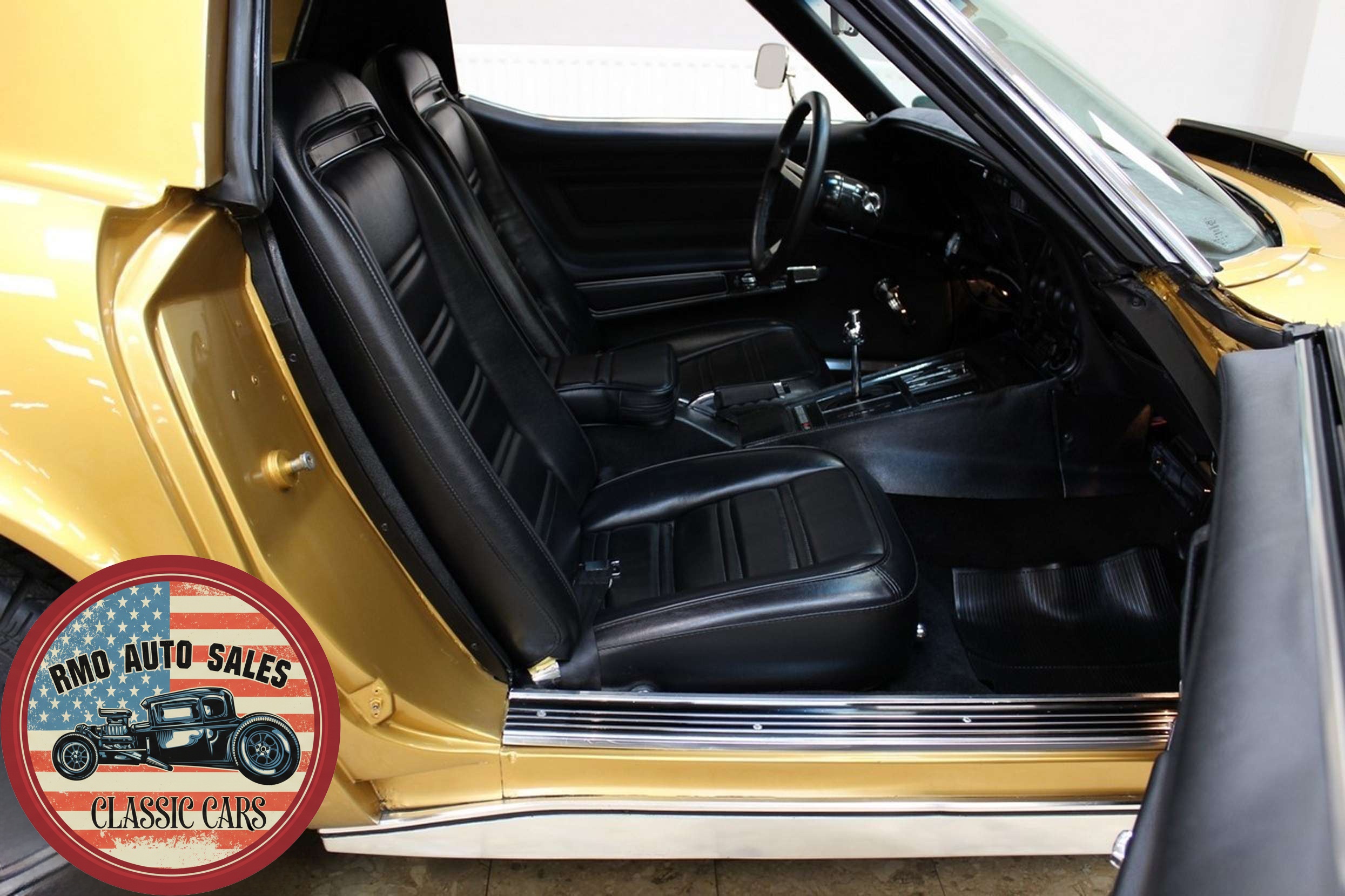 1972 Chevrolet Corvette with a 454 V8 and TH-400 automatic transmission. Finished in War Bonnet Yellow Metallic with black leather seats, featuring factory power steering, 4-wheel power disc brakes, T-top roof, removable rear window, and Rally wheels with Avenger GT radial tires.