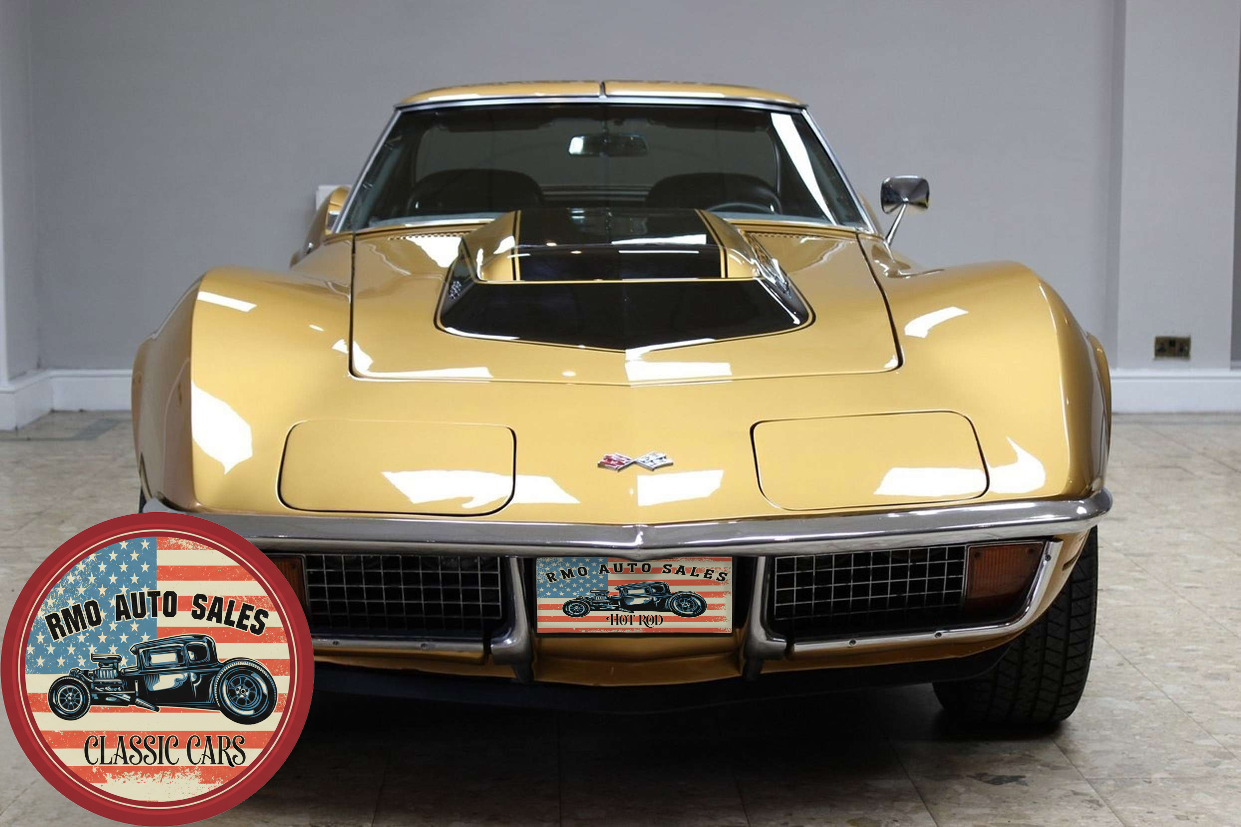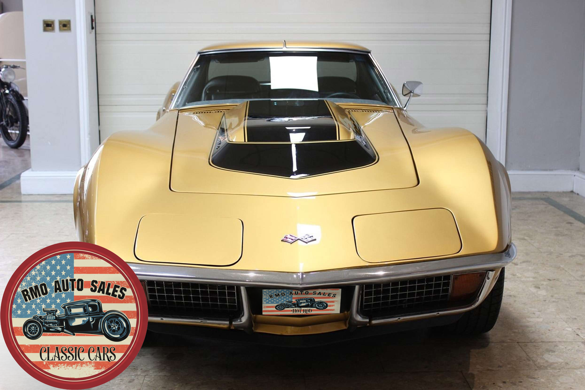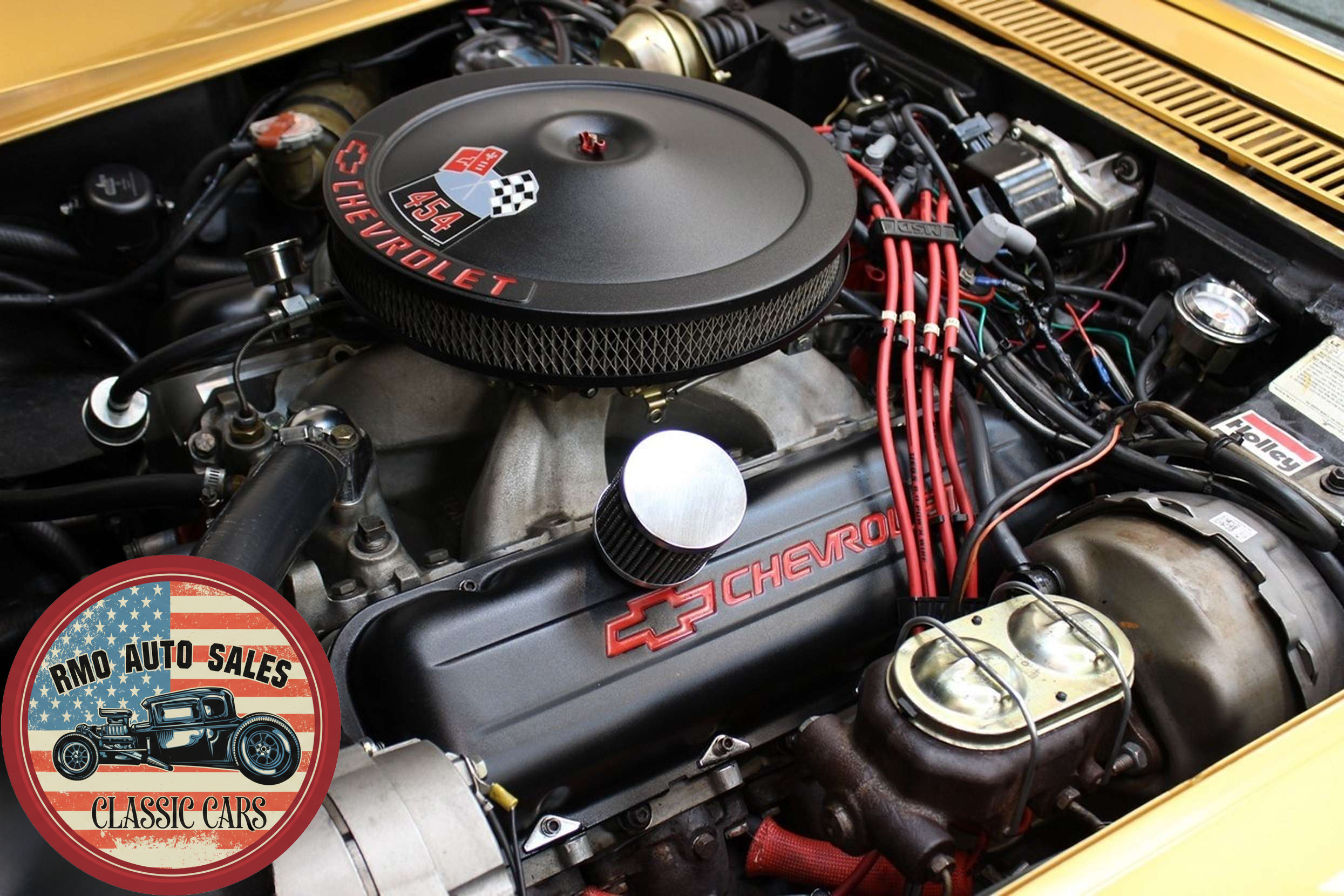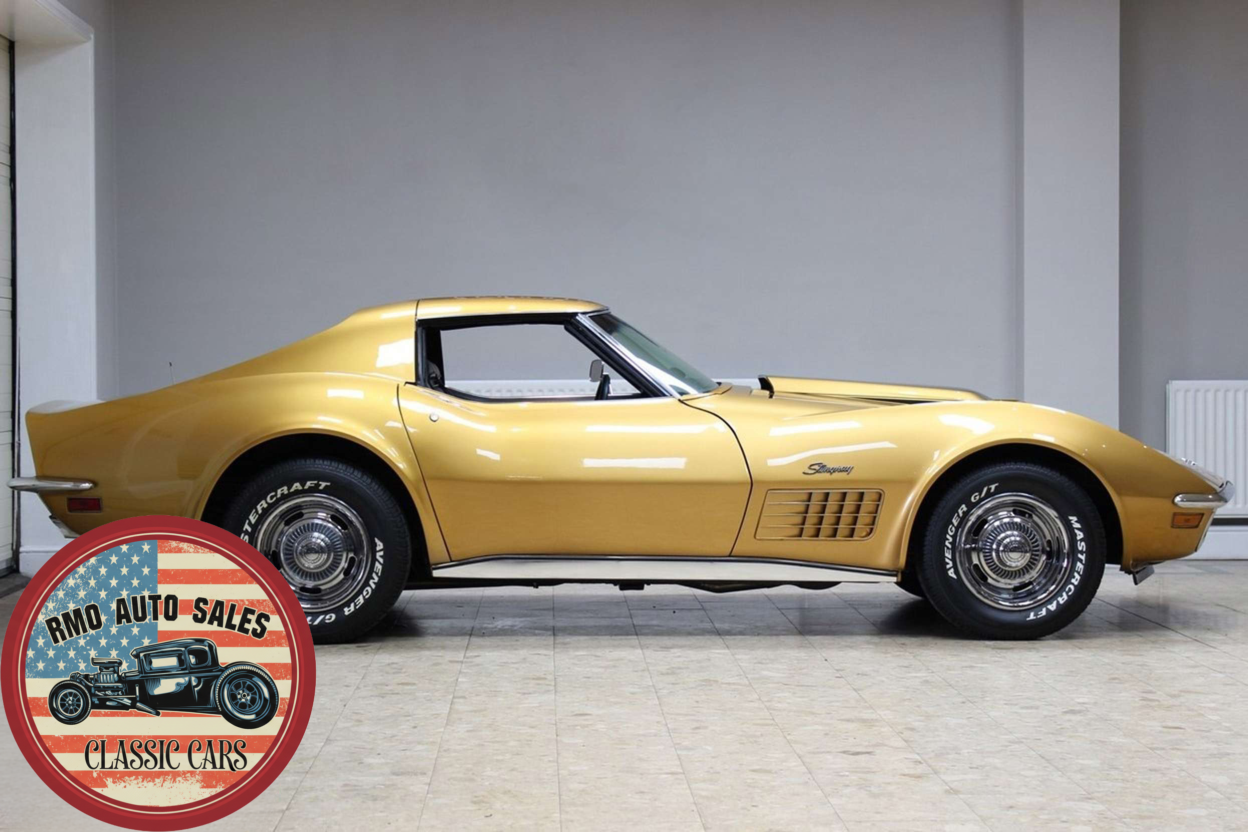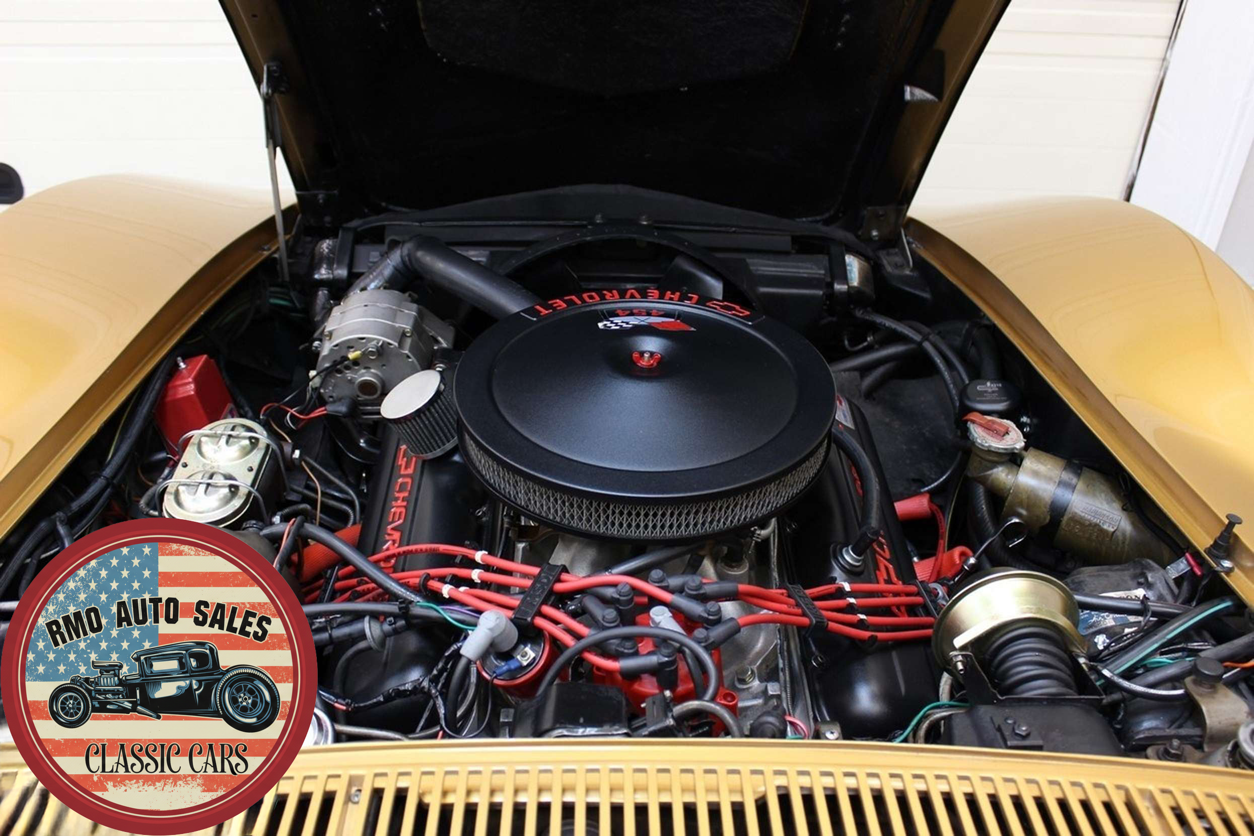1972 Chevrolet Corvette with a 454 V8 and TH-400 automatic transmission. Finished in War Bonnet Yellow Metallic with black leather seats, featuring factory power steering, 4-wheel power disc brakes, T-top roof, removable rear window, and Rally wheels with Avenger GT radial tires.